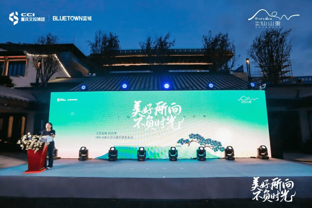 最后,小镇生活启动仪式正式开启,各单位领导步入舞台中央,在一片欢腾的氛围中,在现场来宾的共同见证下,风暴娱乐集团代表童艺强、蓝城集团代表温智泉、重庆建工集团代表崔斌,与业主代表熊女士将一副巨幅卷轴依次传递并共同展开,「世界的仙女山 国际的仙山里」几个大字惊艳亮相,彰显出古朴苍劲,骨气洞达的气质,象征了仙山里项目的美好愿景,自此标志文投蓝城·仙山里小镇中心正式开放!